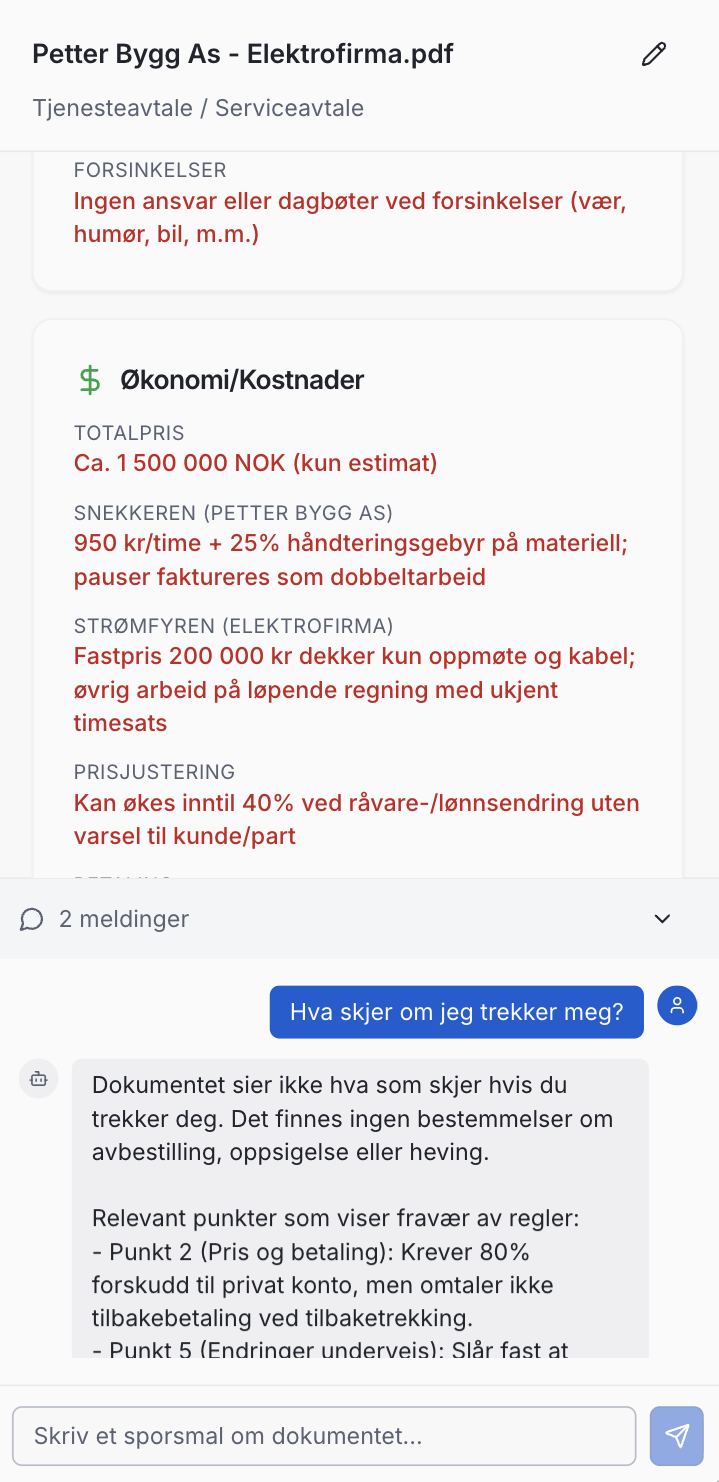 Chat med dokumentene dine og få direkte svar på alt du lurer på om kontrakten.